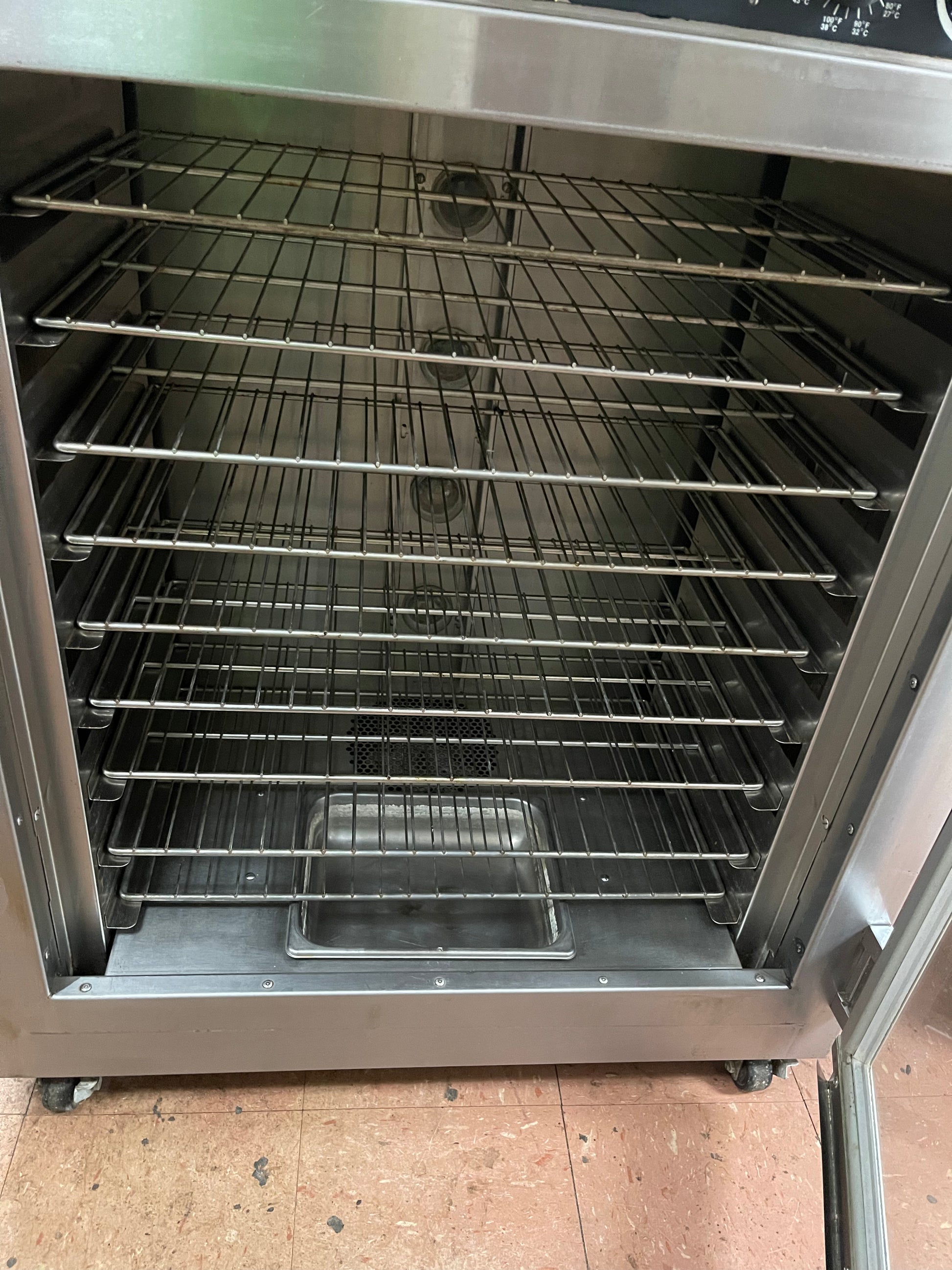 This oven/proofer is used but has been cleaned and tested. There are some scuffs and scratches from use. The dimensions are 37"W x 27.5"D x 77.75"H.