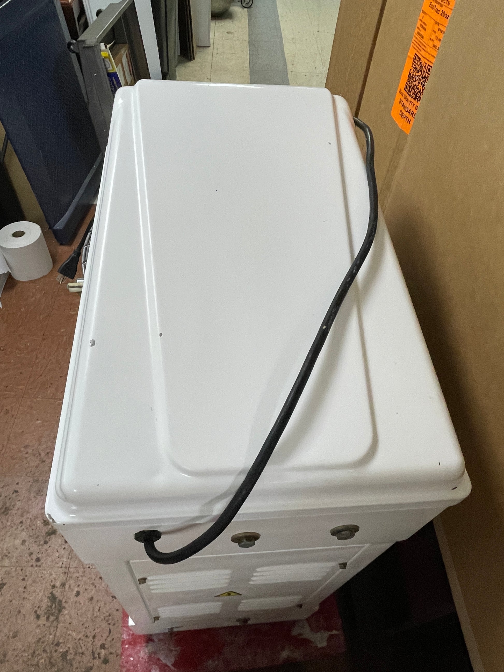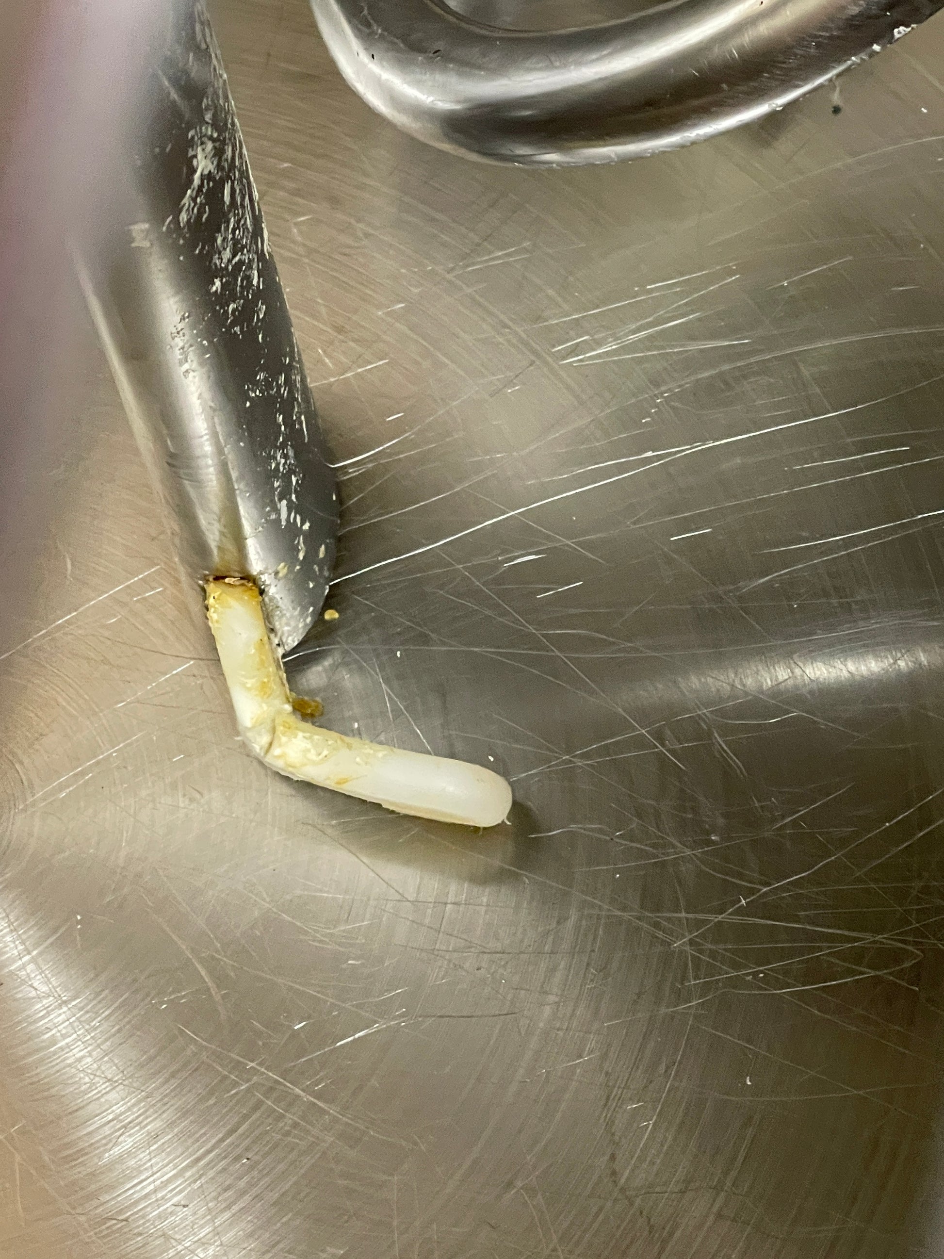This dough mixer is used but has been cleaned and tested. There are some scuffs and scratches from use. The plastic foot on the pole is bent (see pictures) but everything works as it should.