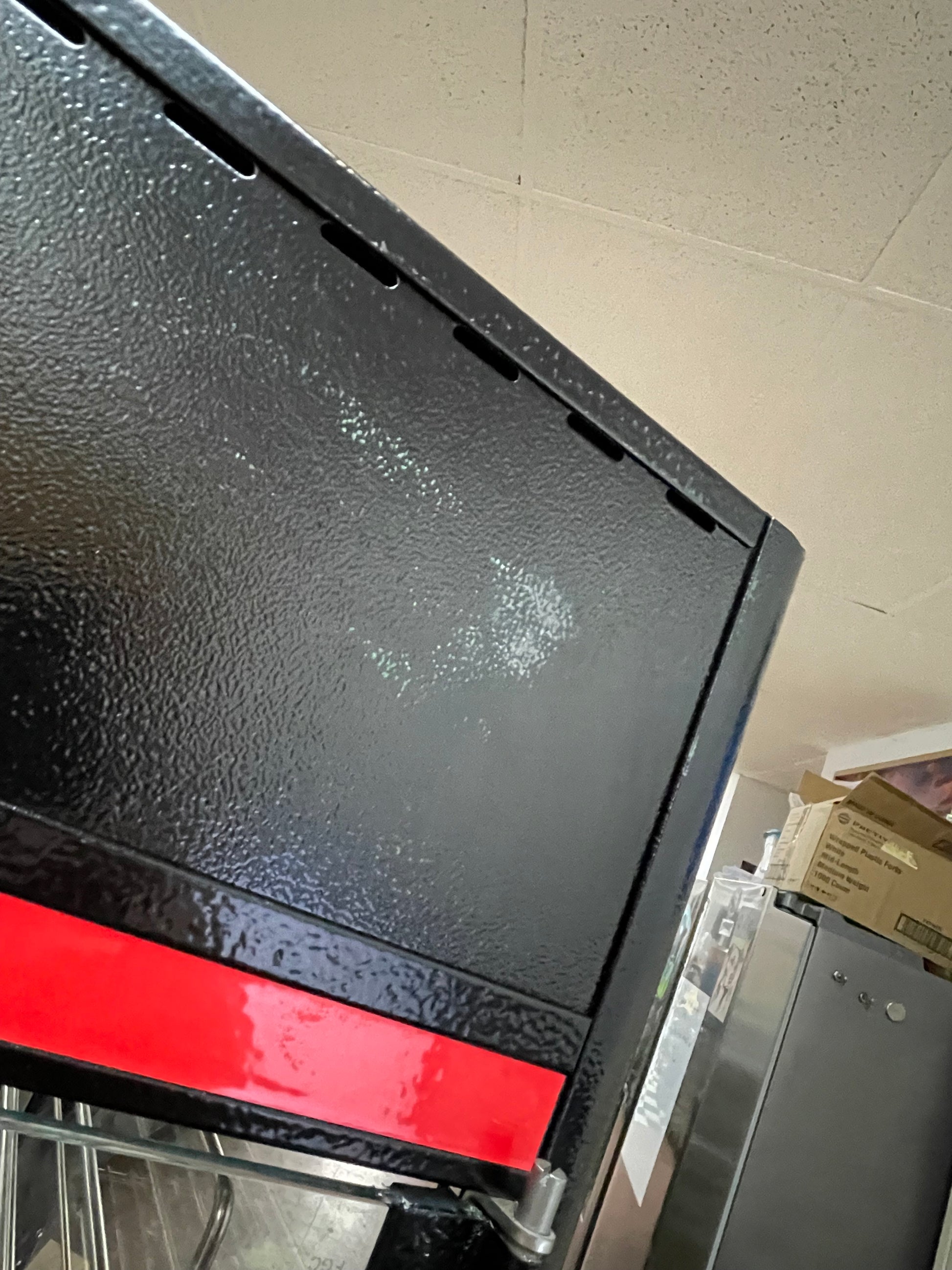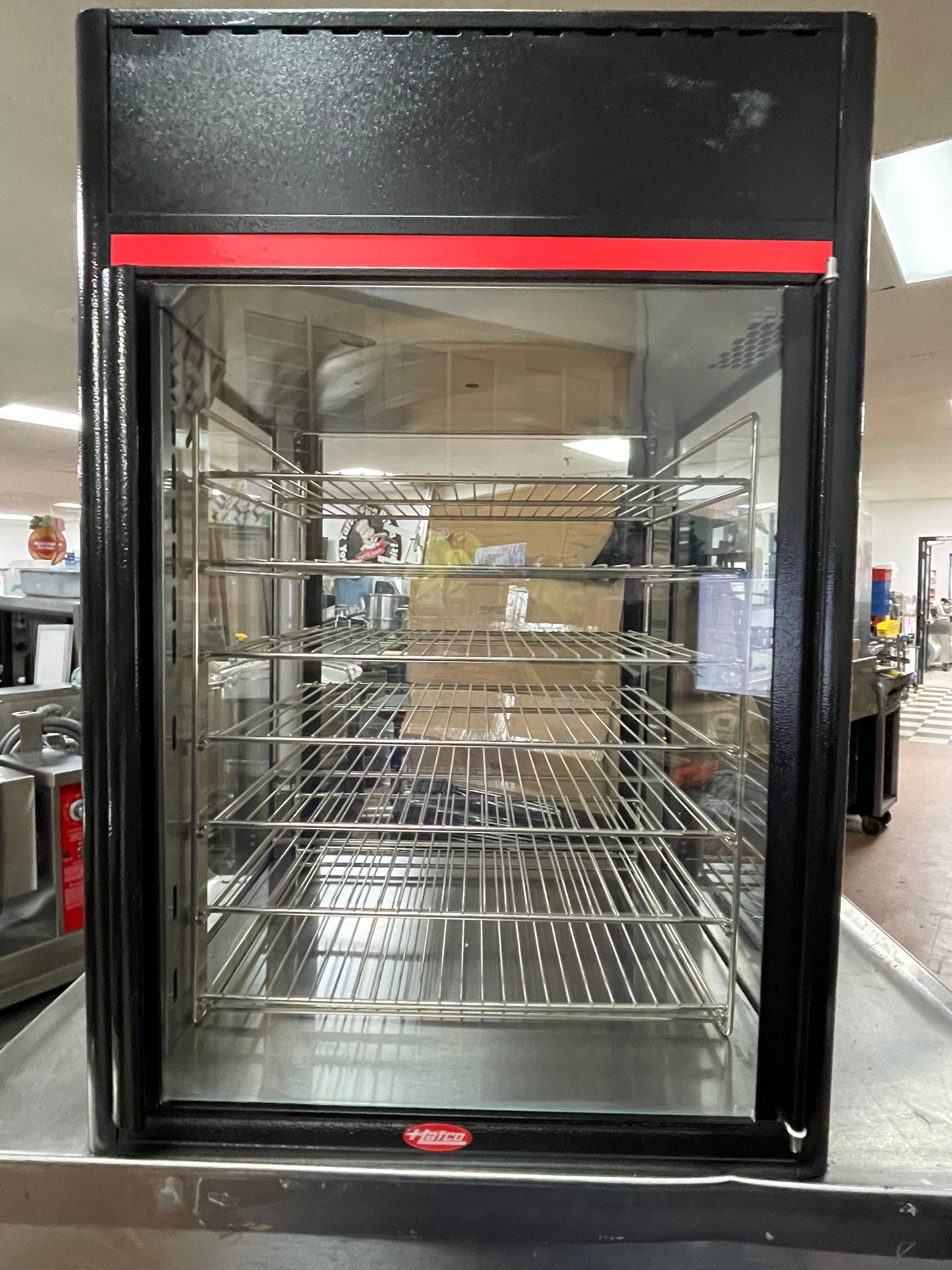 This warming display is used but has been cleaned and tested, There are some minor scuffs on it from use. This warmer is in great condition. This has a 7 tier rack included.
