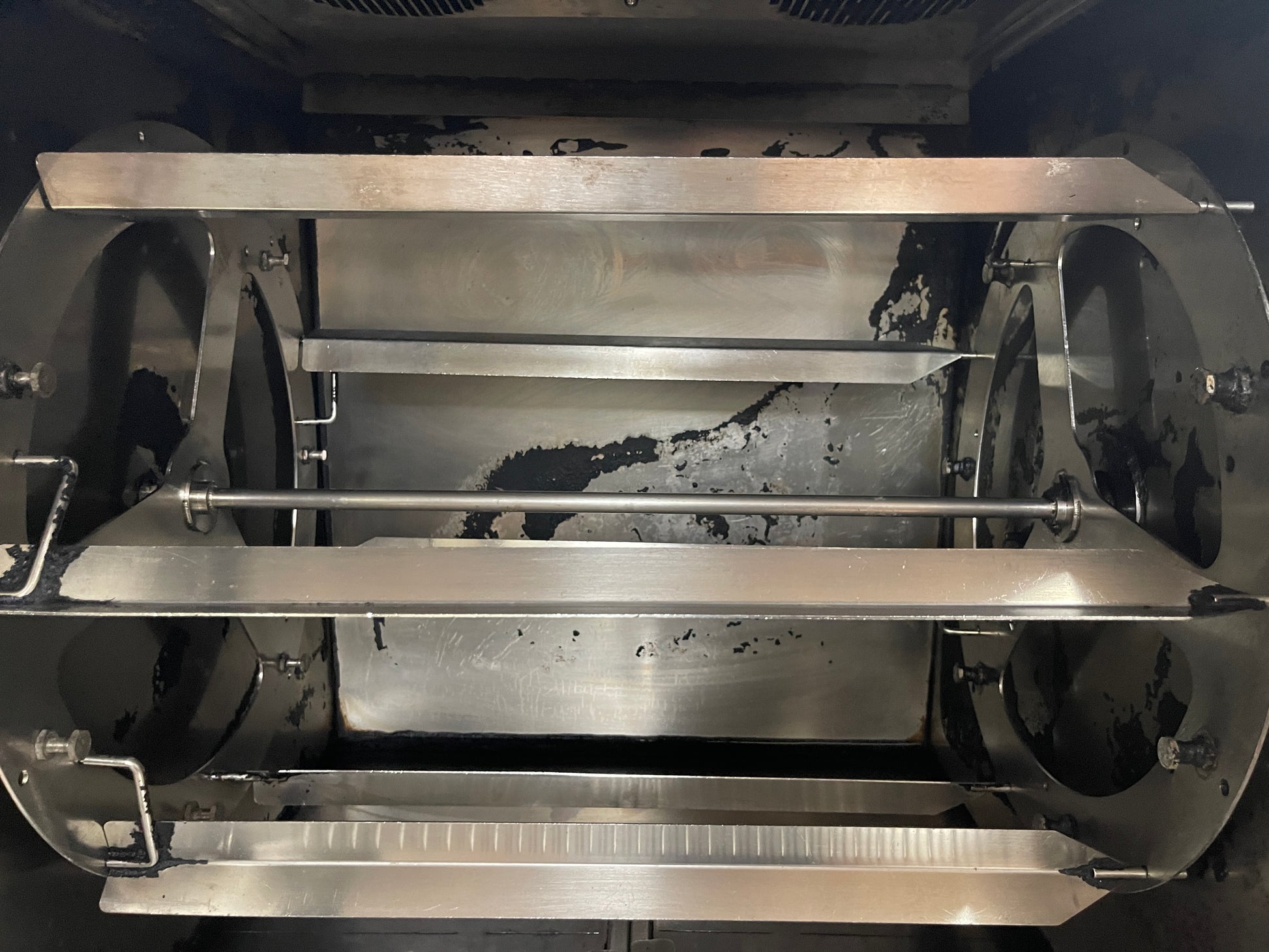 This oven is used but has been cleaned and tested. There are some scuffs and scratches from use. This has 7 spits and 3 baskets included.