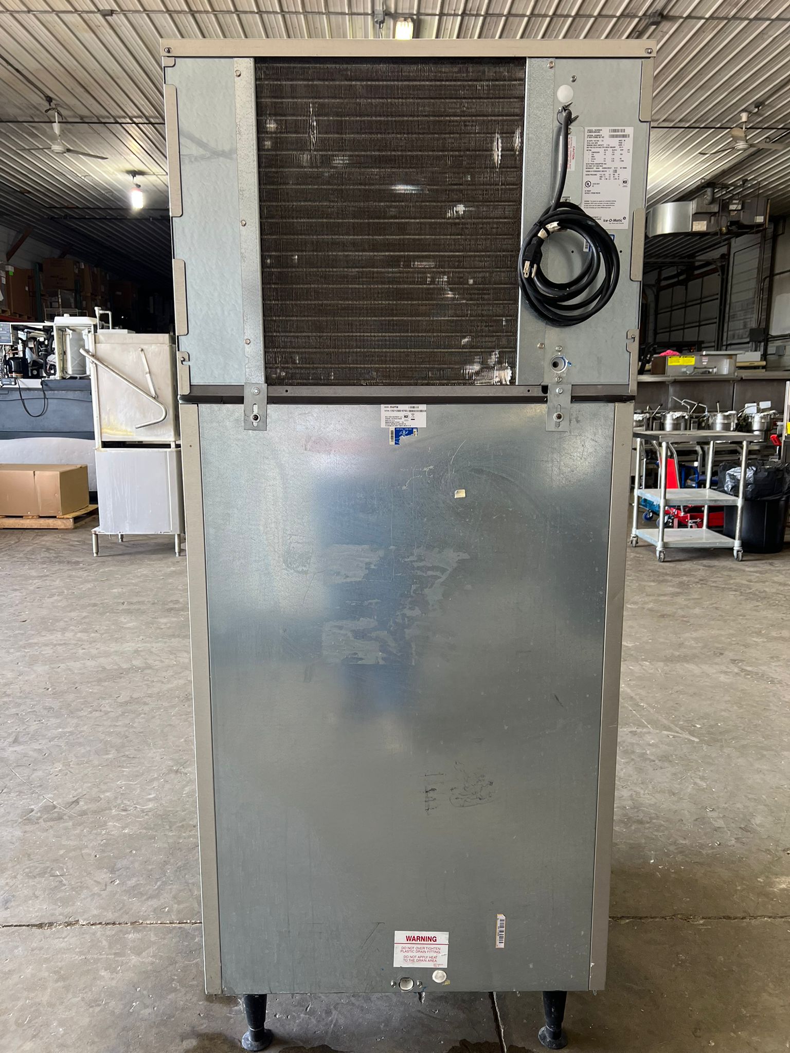 This ice machine and bin are used but have been tested. There are some scuffs and scratches from use. The bin holds 510lbs of ice. The dimensions are 30"W x 31"D x 71.25"H.