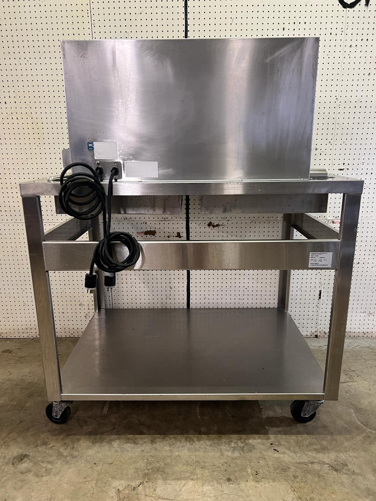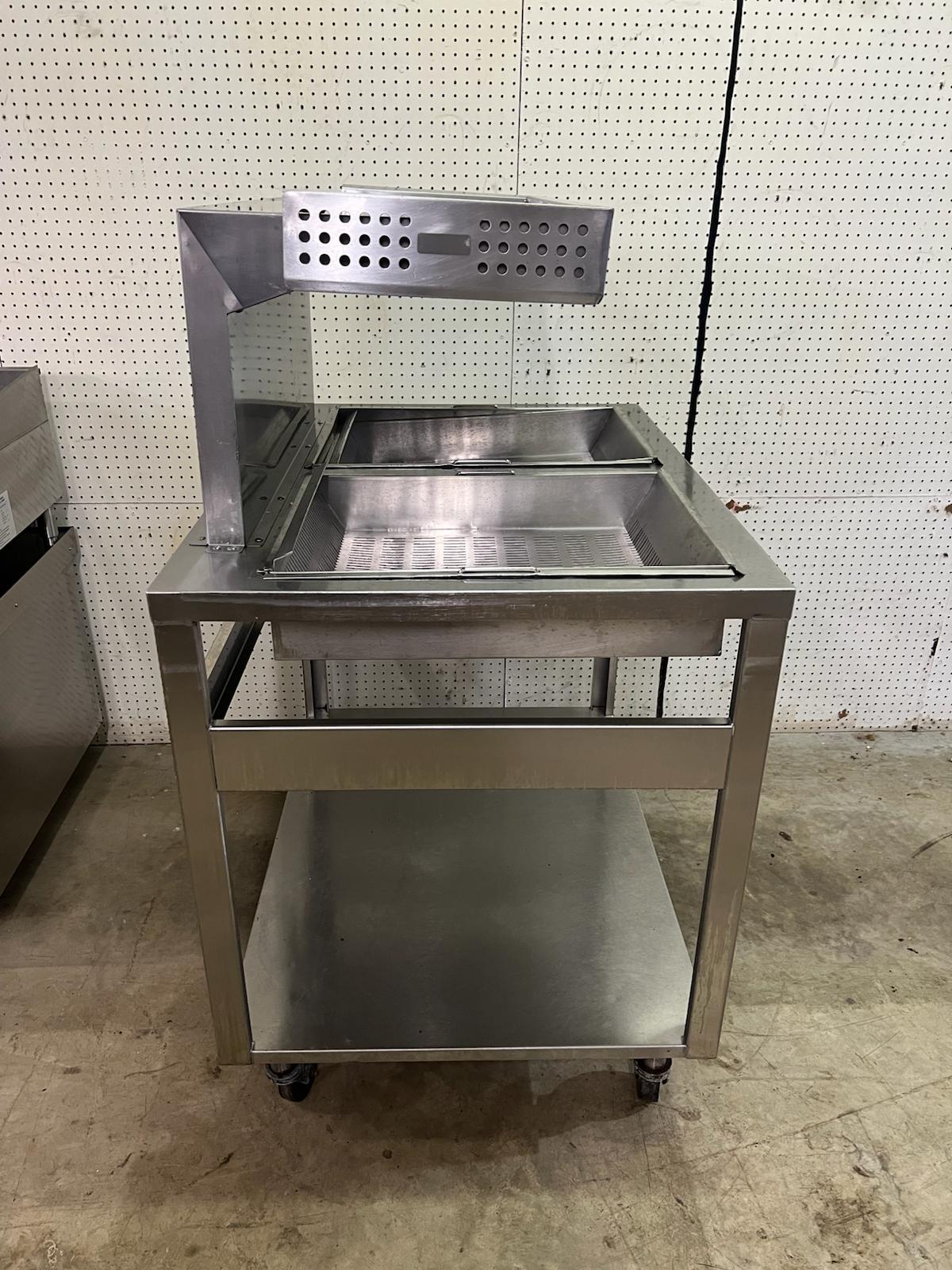 This fryer dump station is used but has been cleaned and tested. This does have some scratches and stains on it from use. Some of the light bulbs also need replaced.. The dimensions are 44" L x 32" D x 58"H.
