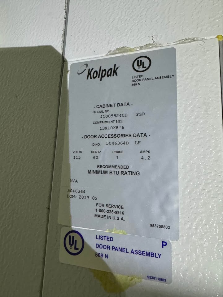 Beautiful Kolpak Walkin cooler/freezer combo. Split evenly. Floor in freezer and complete floor screed for cooler. Both self contained drop in unit just need power. Has heated evap pan for drainage. 1 phase equipment. Walkin is in very good condition with no trouble coming apart. Panels are all numbered in sequence for re-installation. One of the nicest used boxes available for 1/3 of new cost.