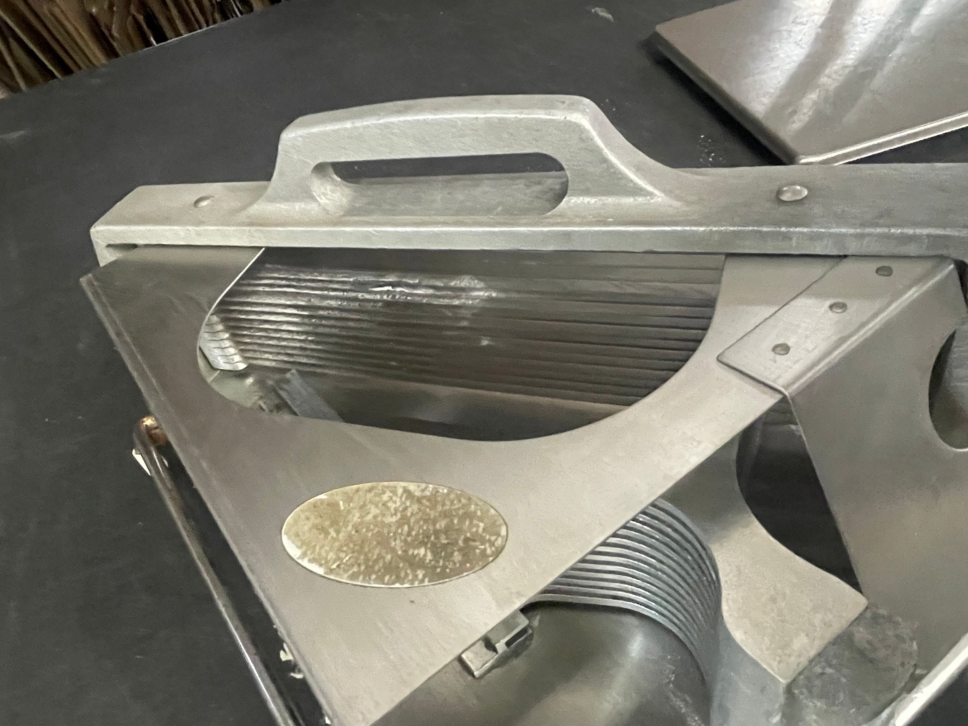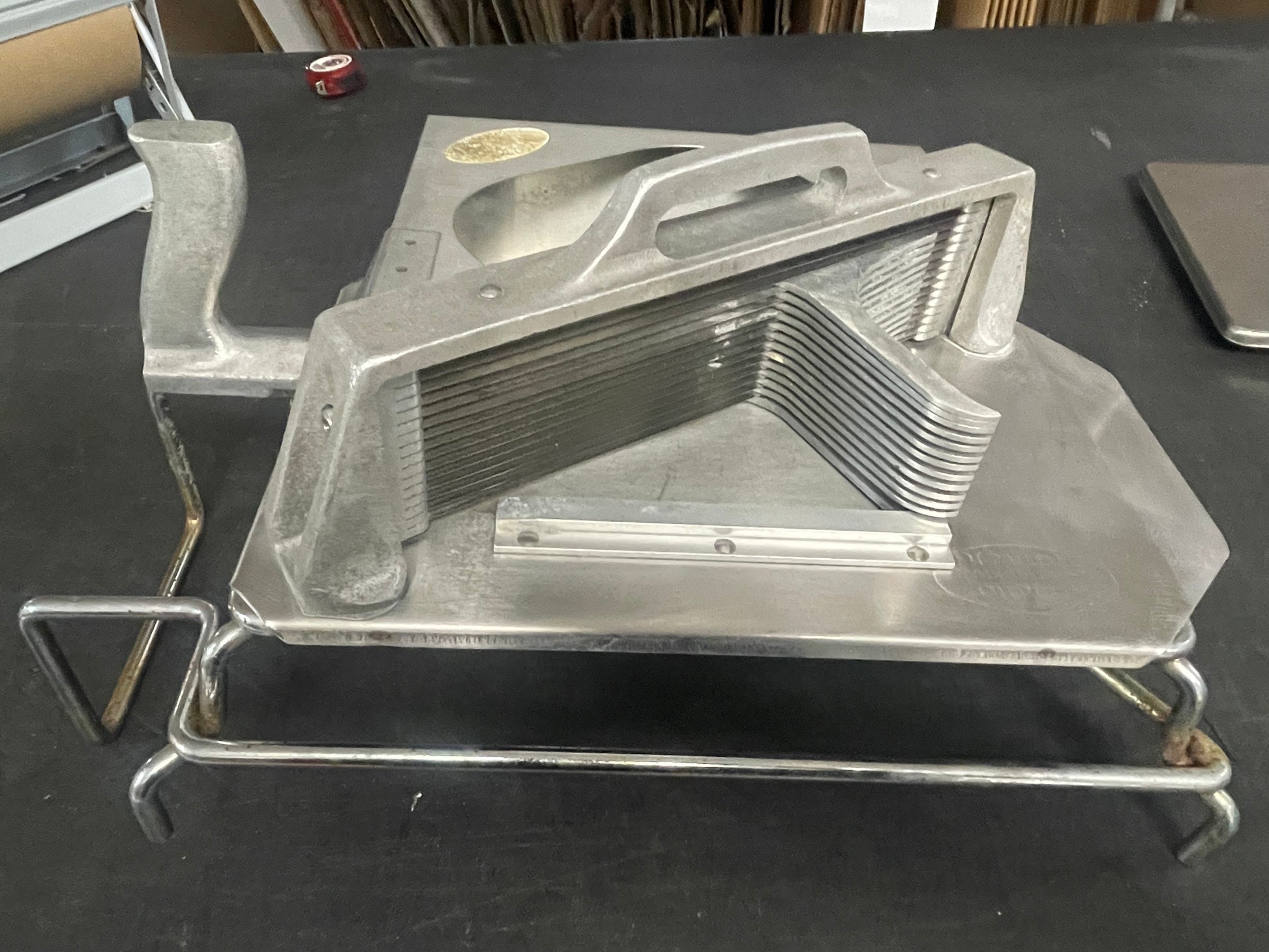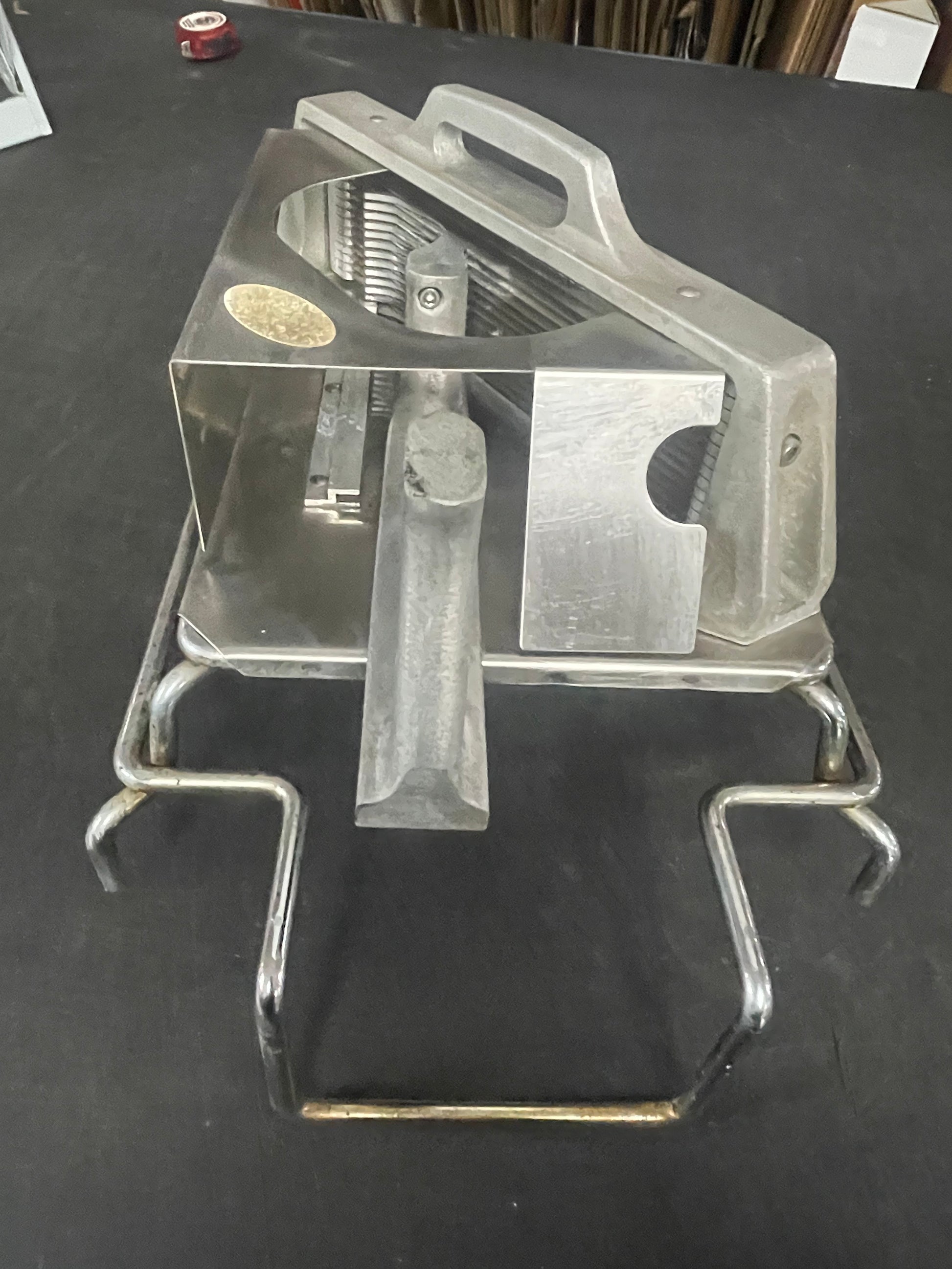 This tomato slicer is used but has been cleaned and inspected. There are some signs of use but it is still in good working condition.