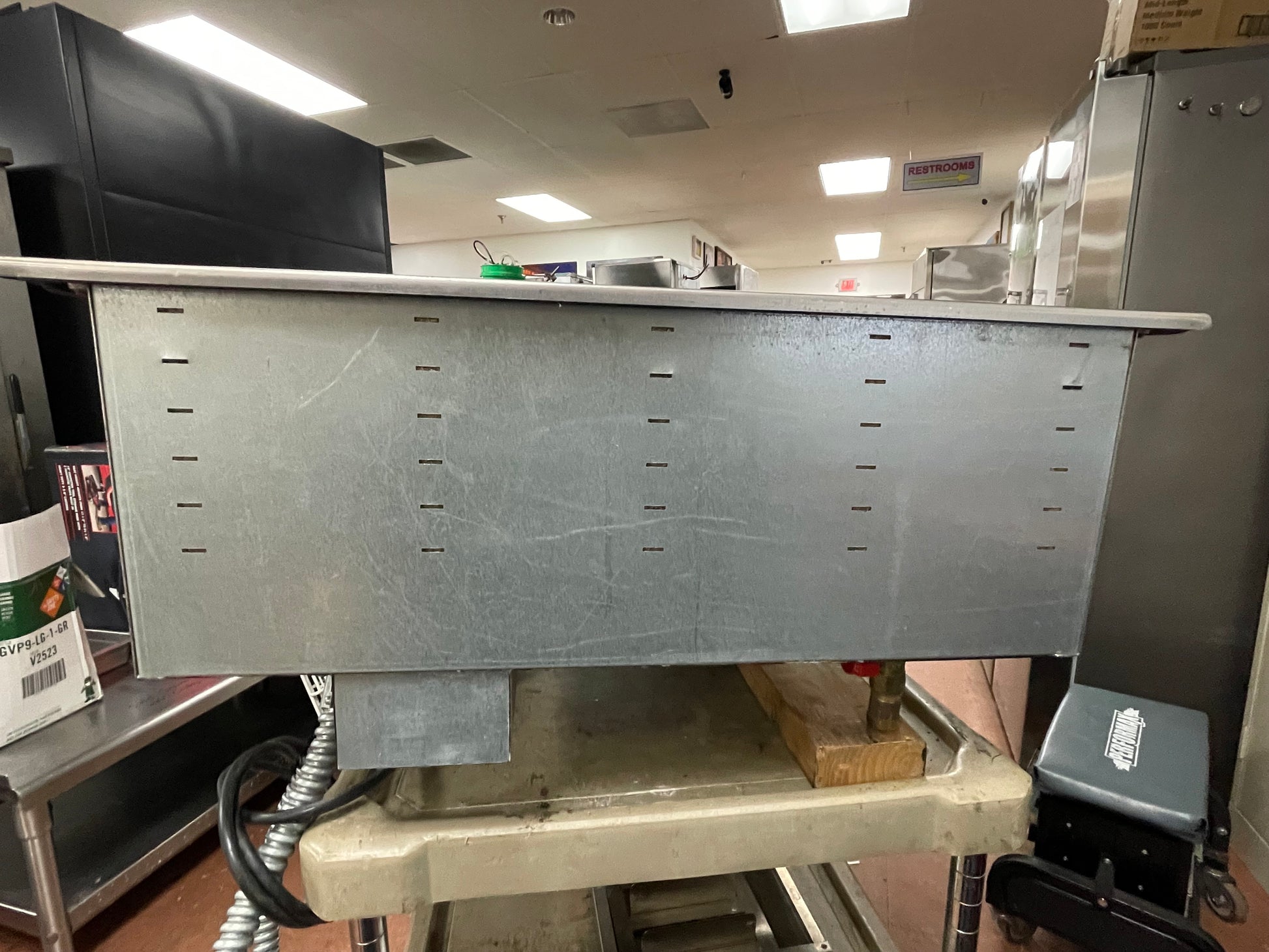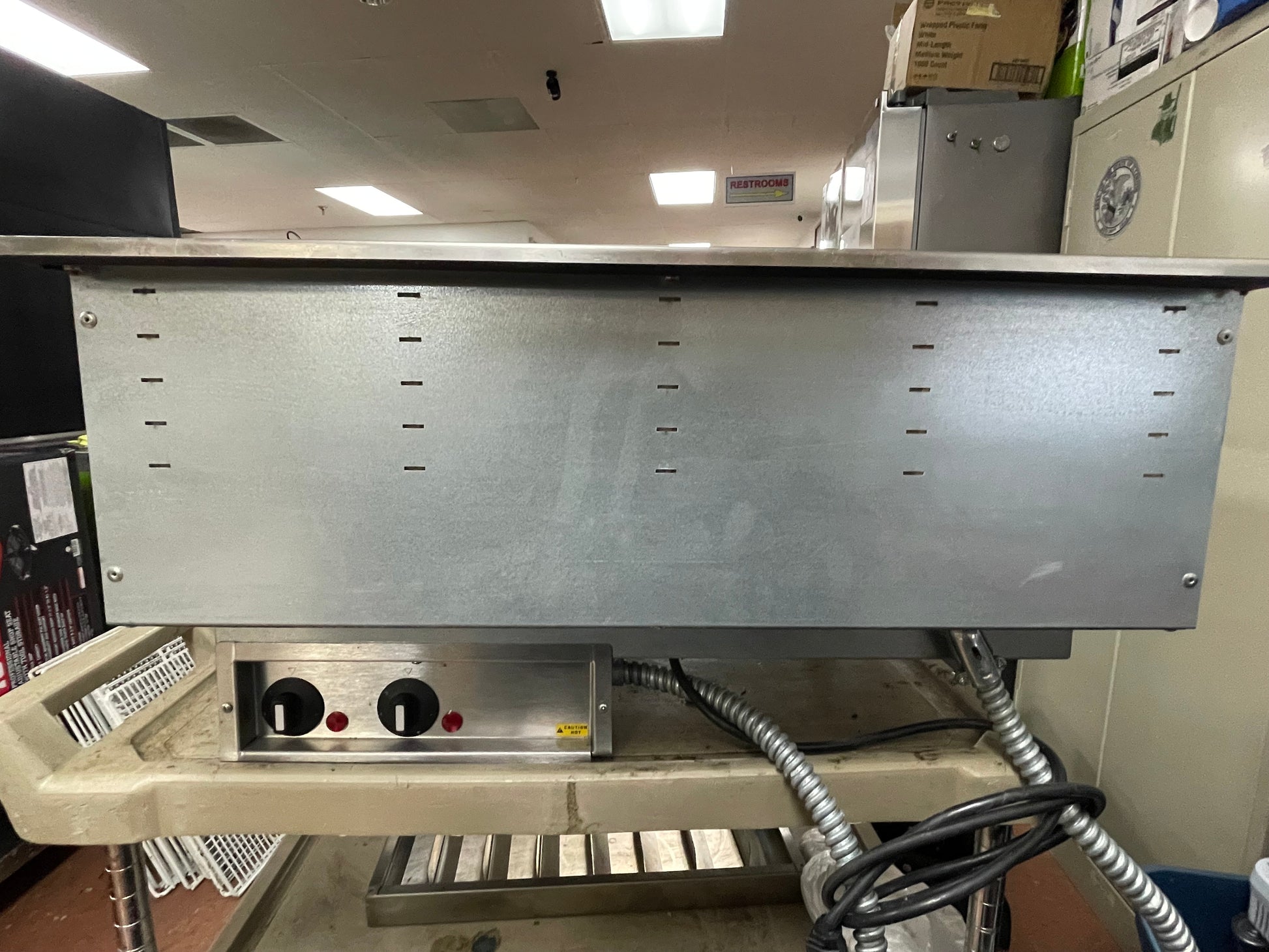 This drop in food warmer us used but has been cleaned and tested. There are some scuffs and scratches on it from use. One of the red lights are missing on the control panel. Cut out dimensions are 27.25"L x 23"W.