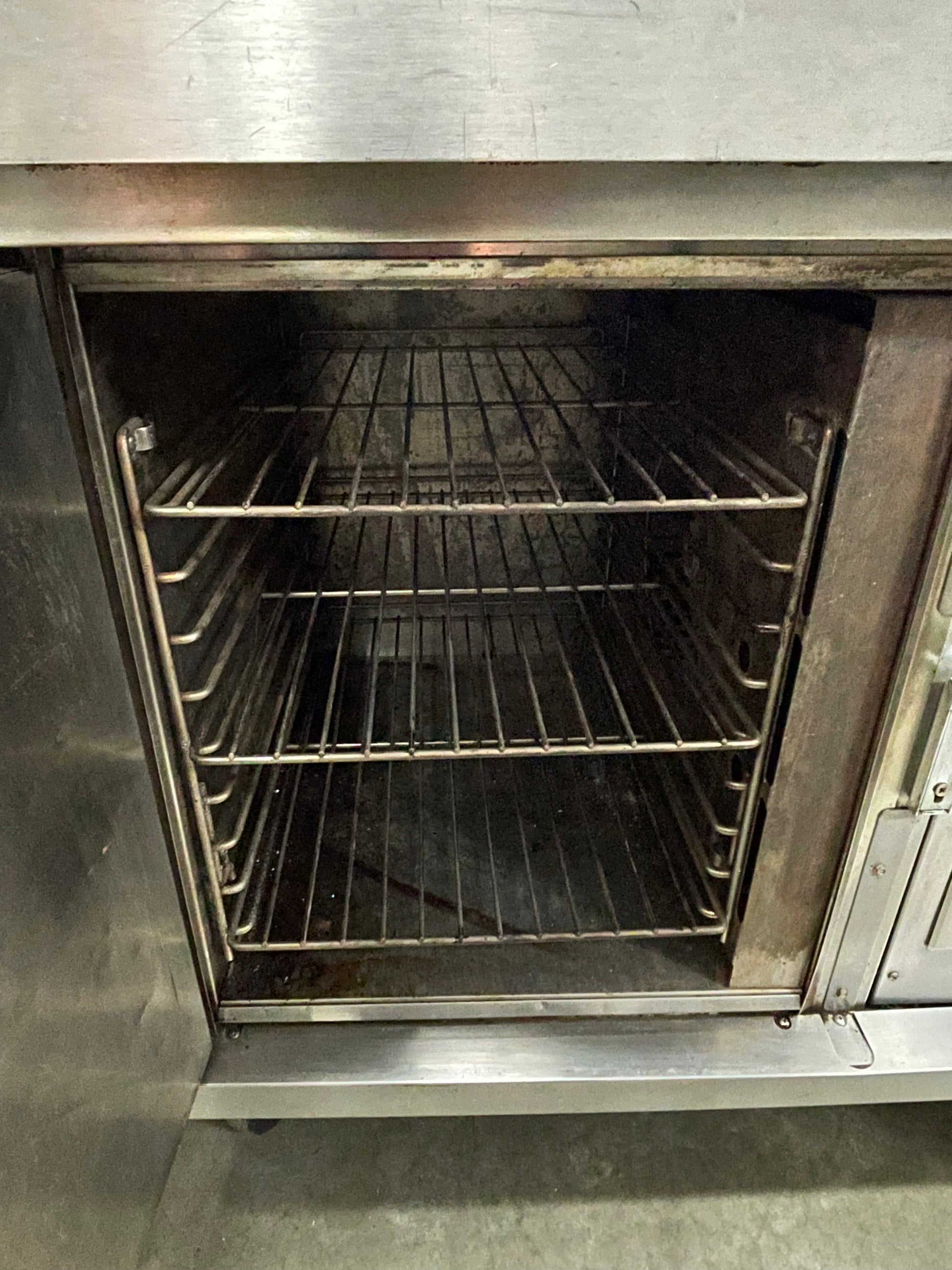 This oven is used but has been cleaned and tested. There are some scuffs and scratches on it from use. The dimensions are 30.25"W x 28"D x 34"H.