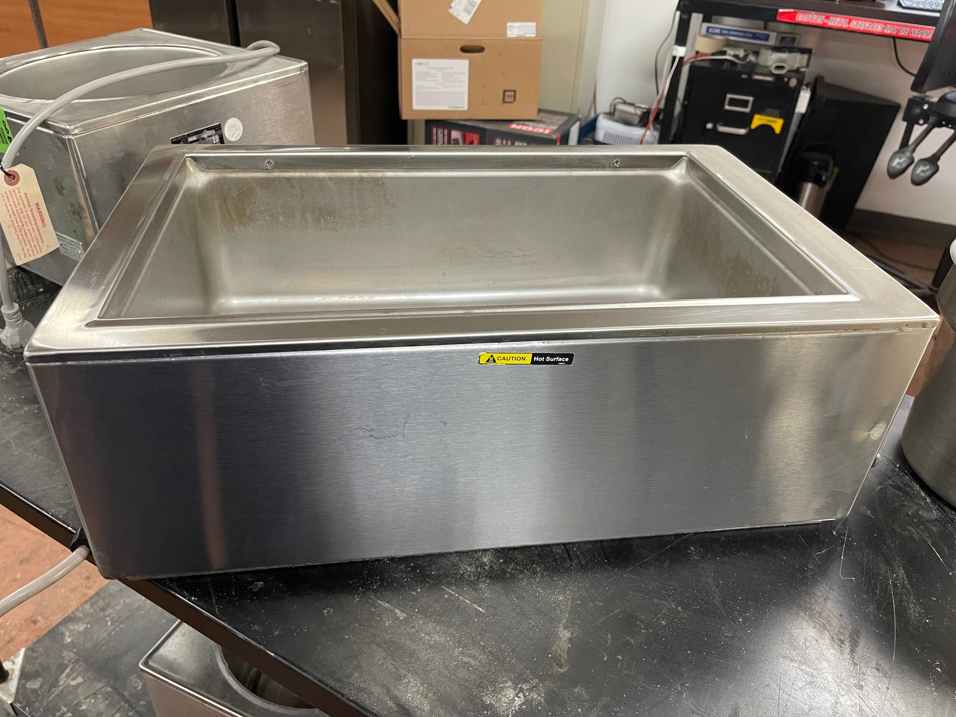 This food warmer is used but has been cleaned and tested. There are some scuffs and scratches from use. The dimensions are 14.7"W x 25.1"D x 8.5"H.