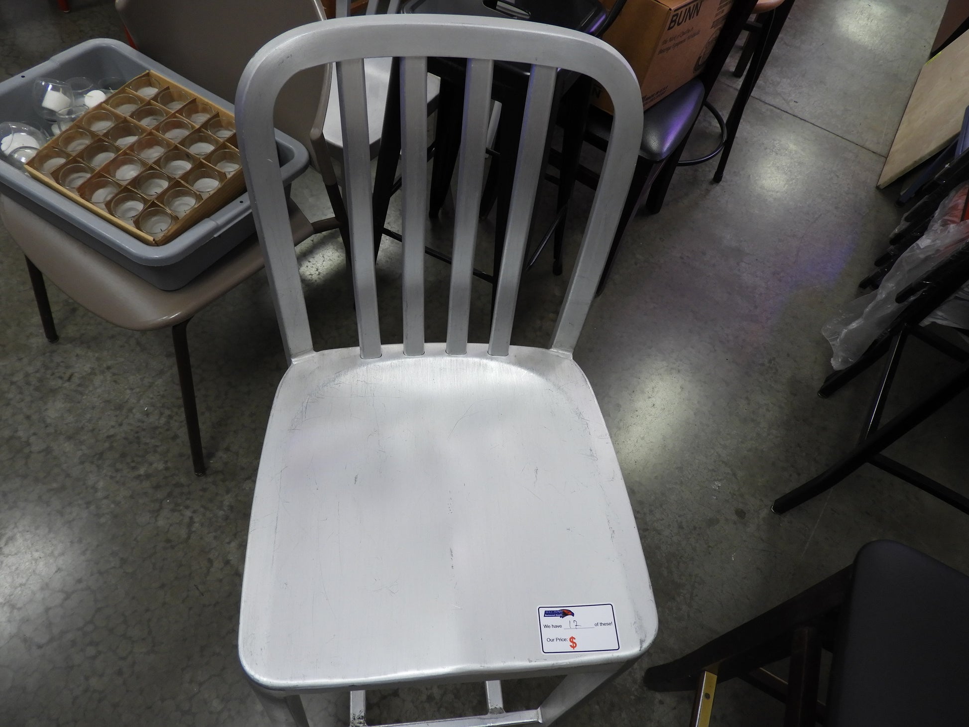 Used Aluminum Light Weight Silver Navy Indoor / Outdoor Bar Height Stool with Vertical Slat Back