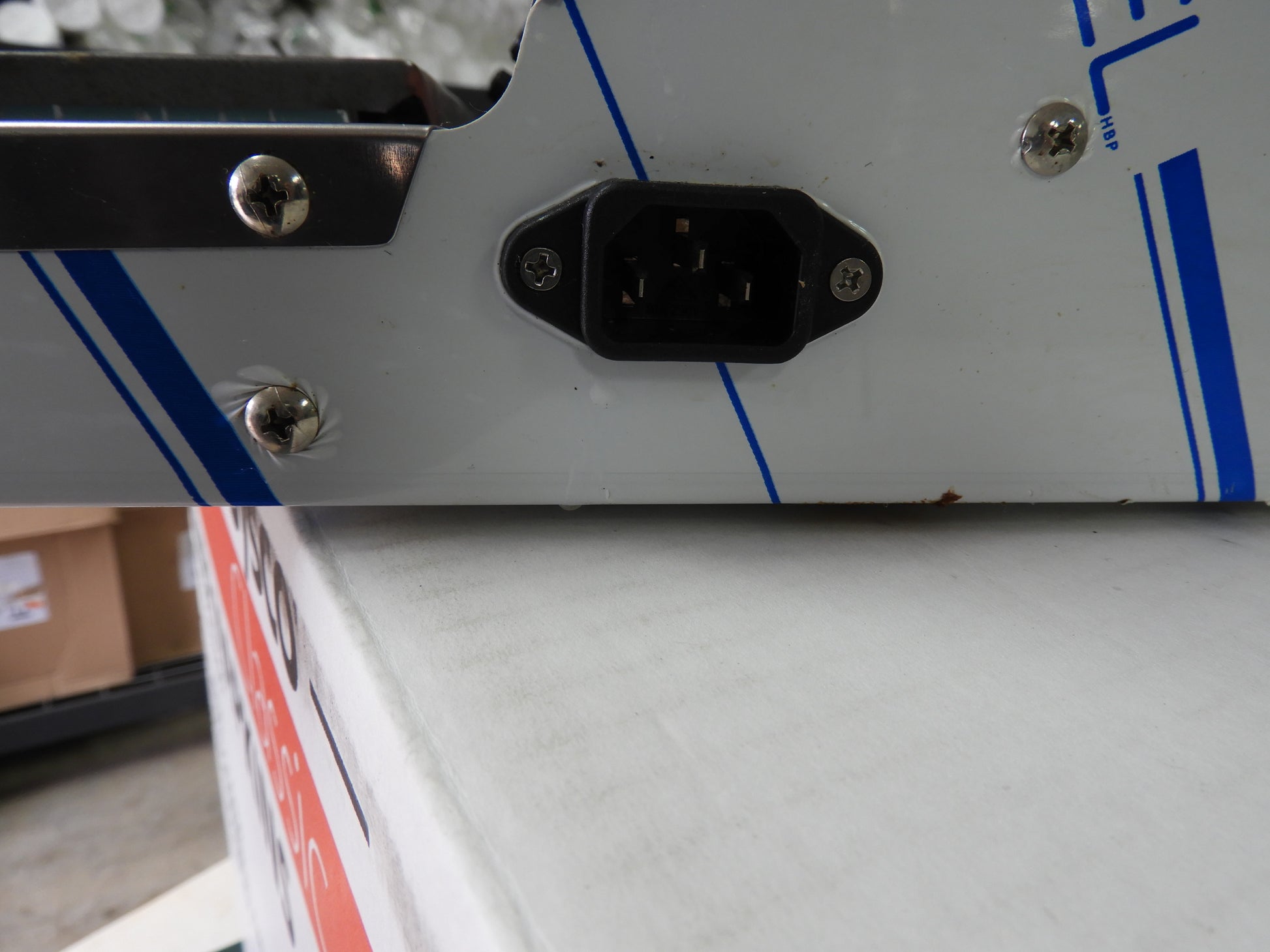 This film wrapper is used but has been cleaned and tested. There may be minor scuffs or scratches on it from normal use. The dimensions are 23.3 x 21.7 x 5.25 inches.