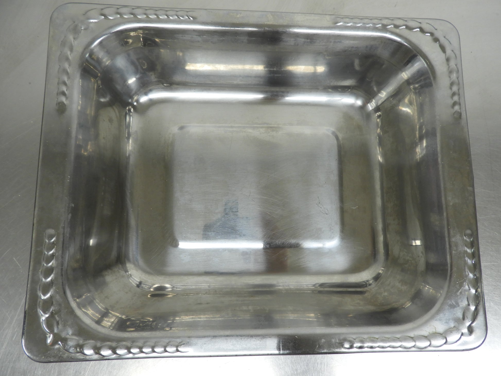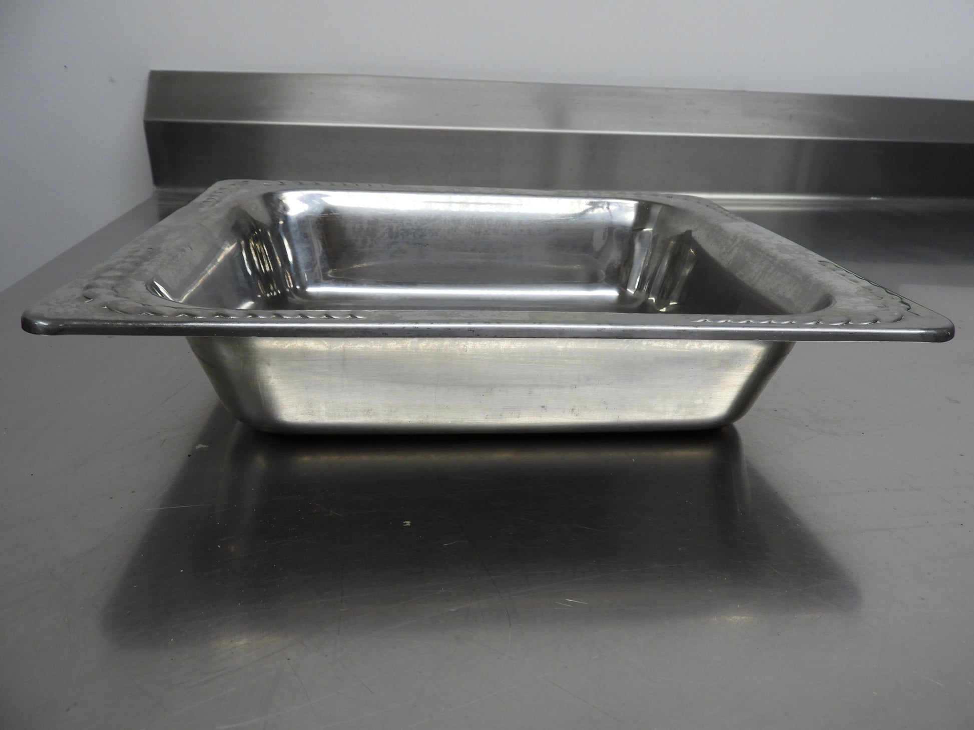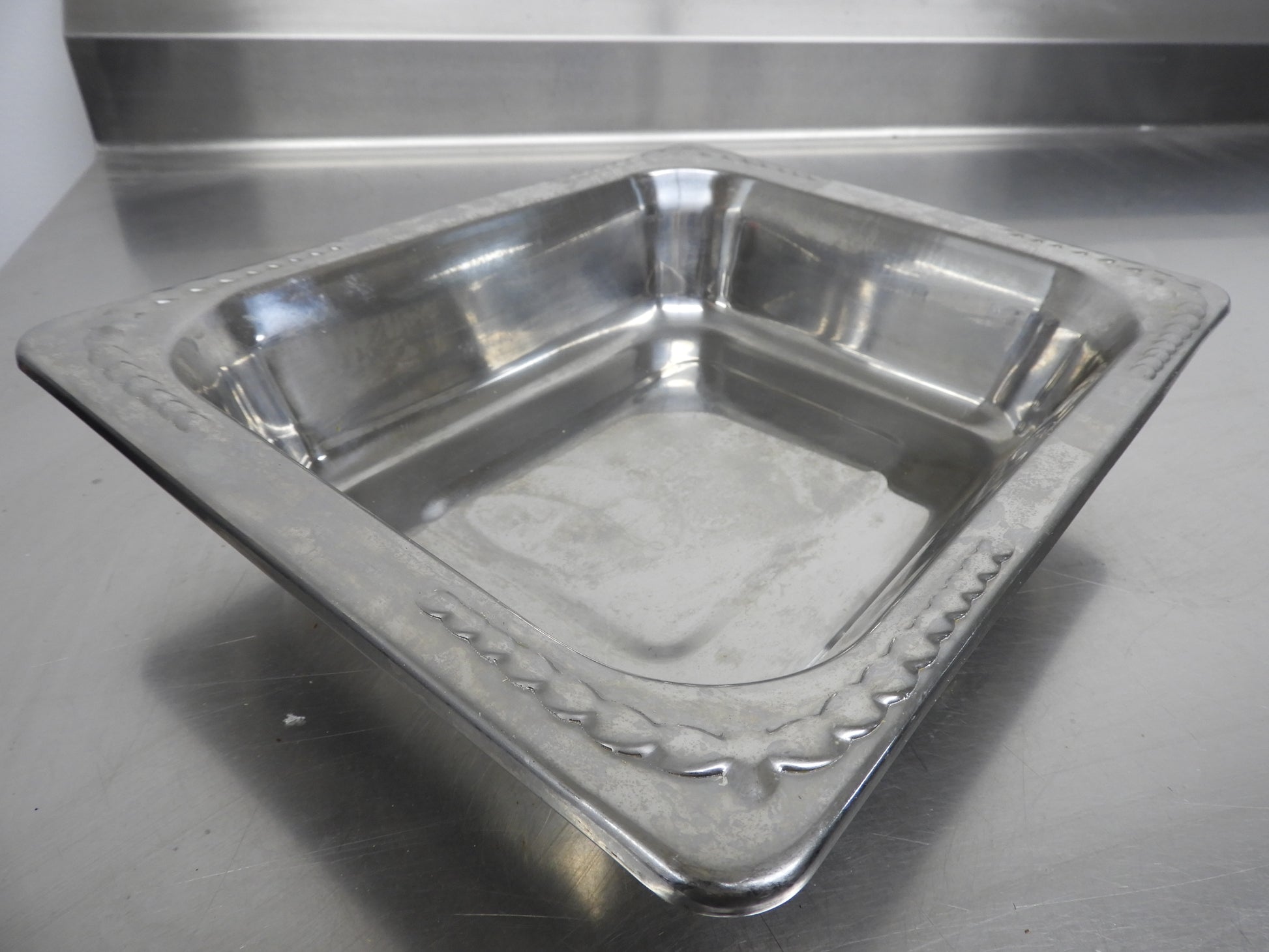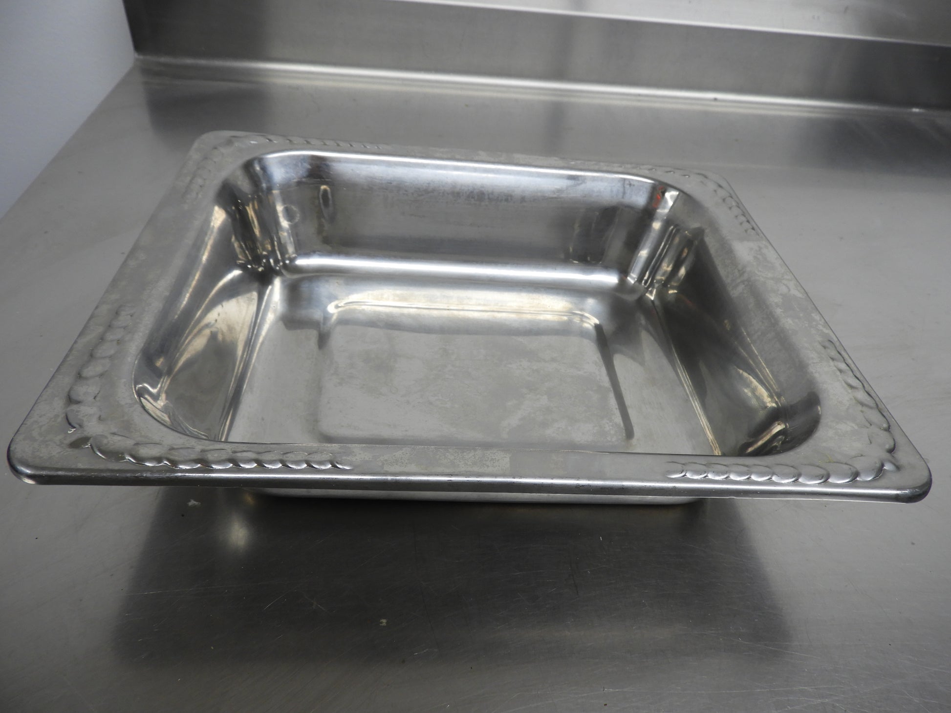 This food pan is used but in good condition. This is a very heavy sturdy pan with a decorative edge. There may be minor scuffs or scratches on it from normal use,