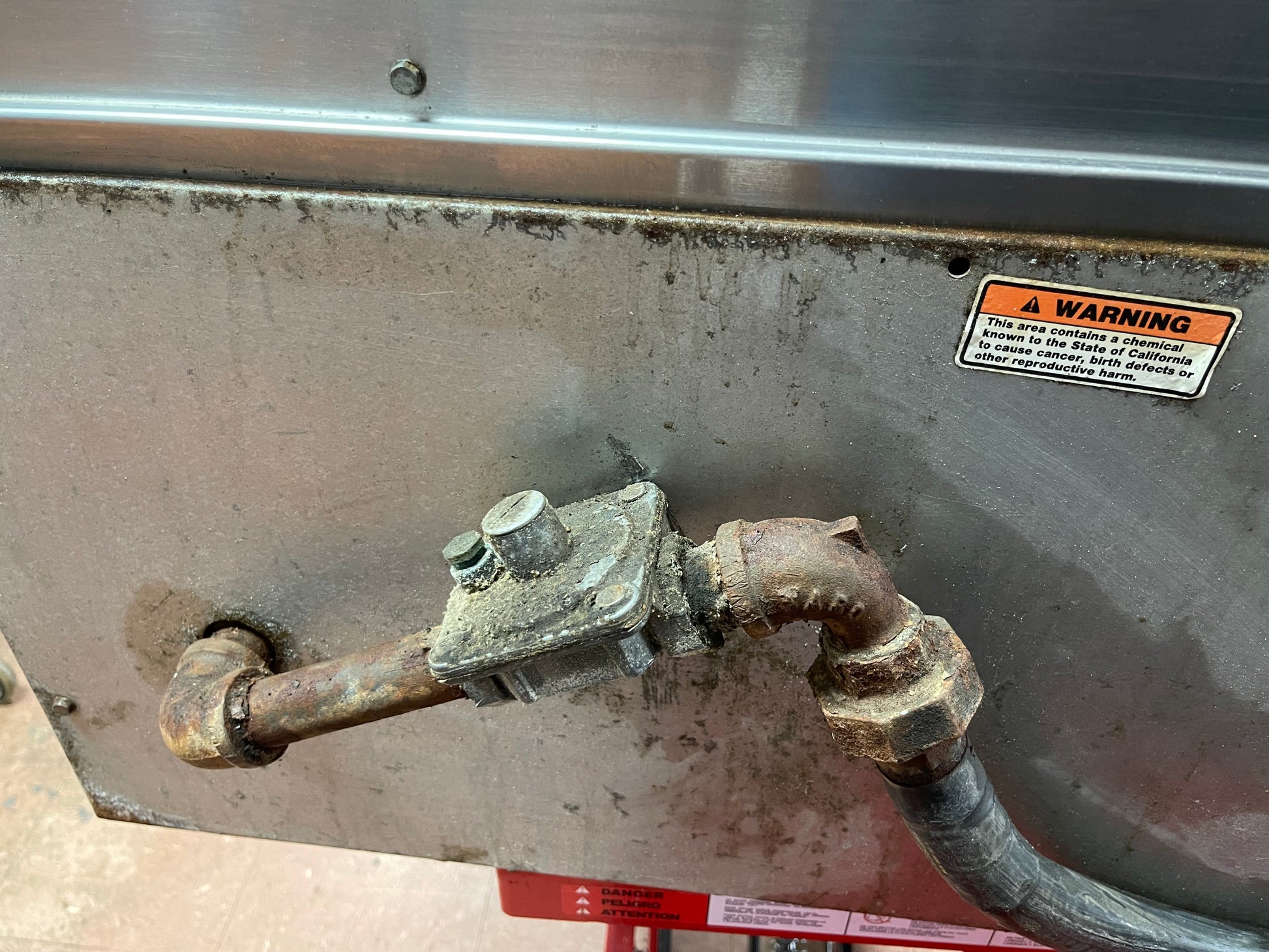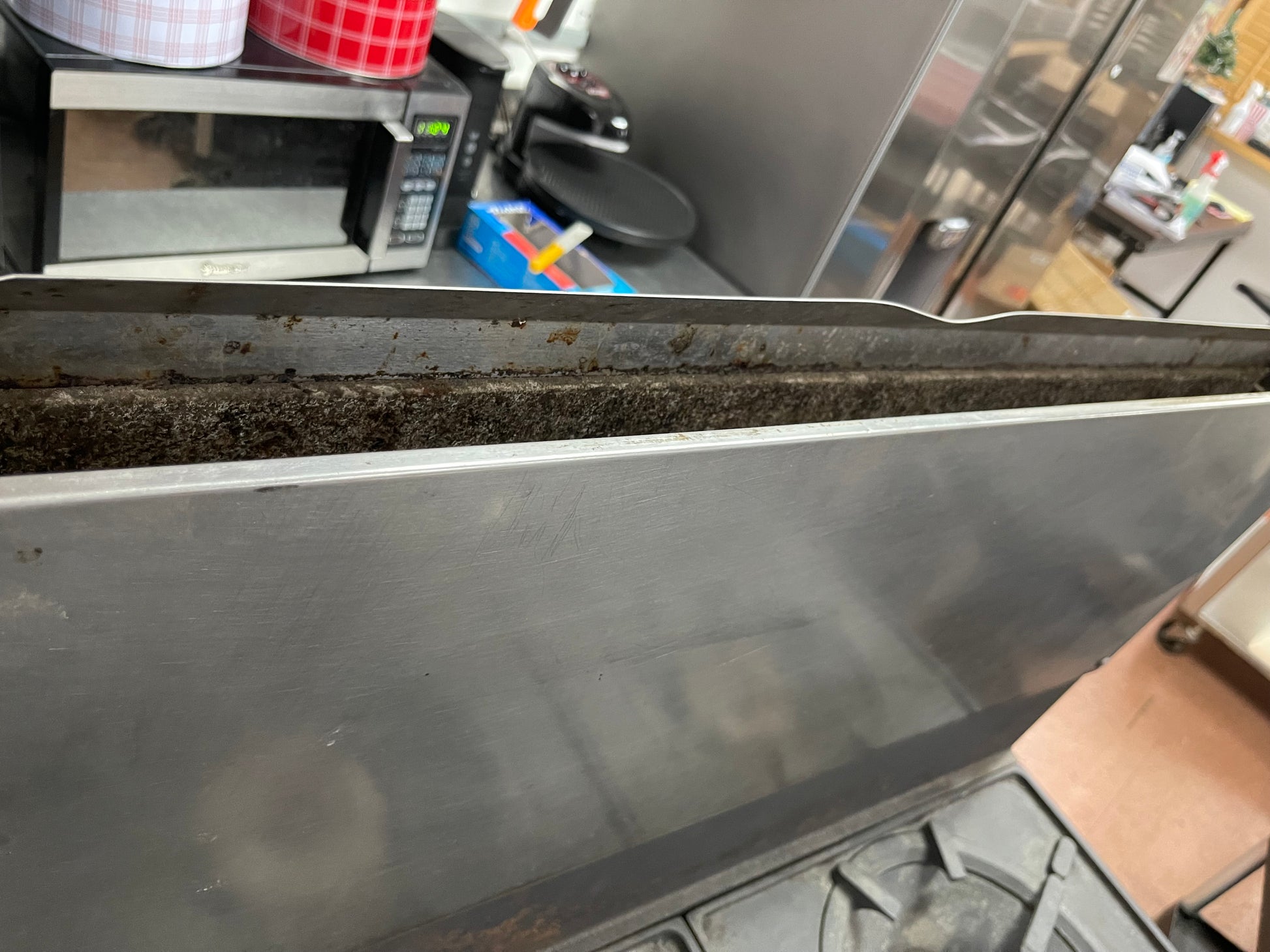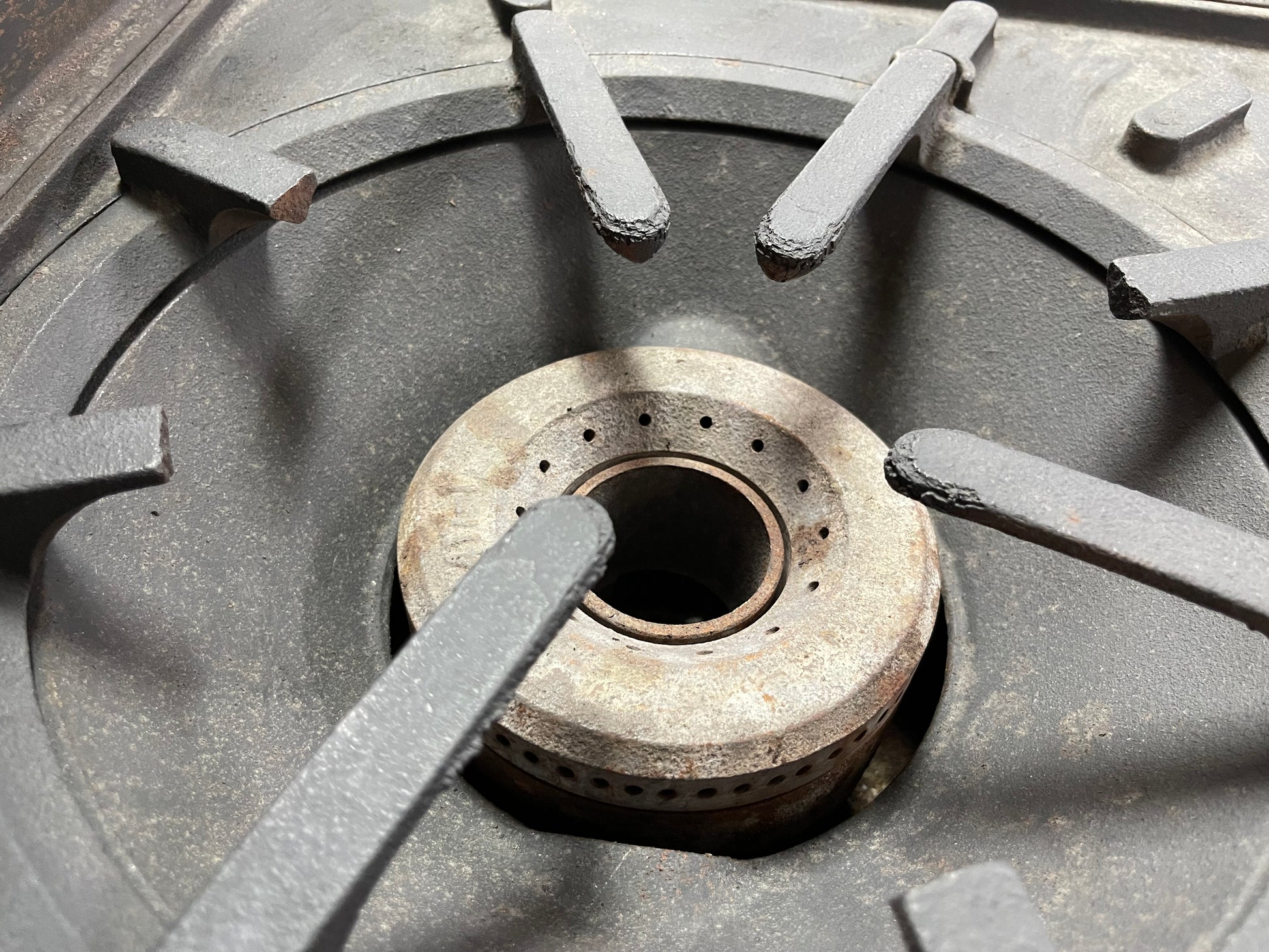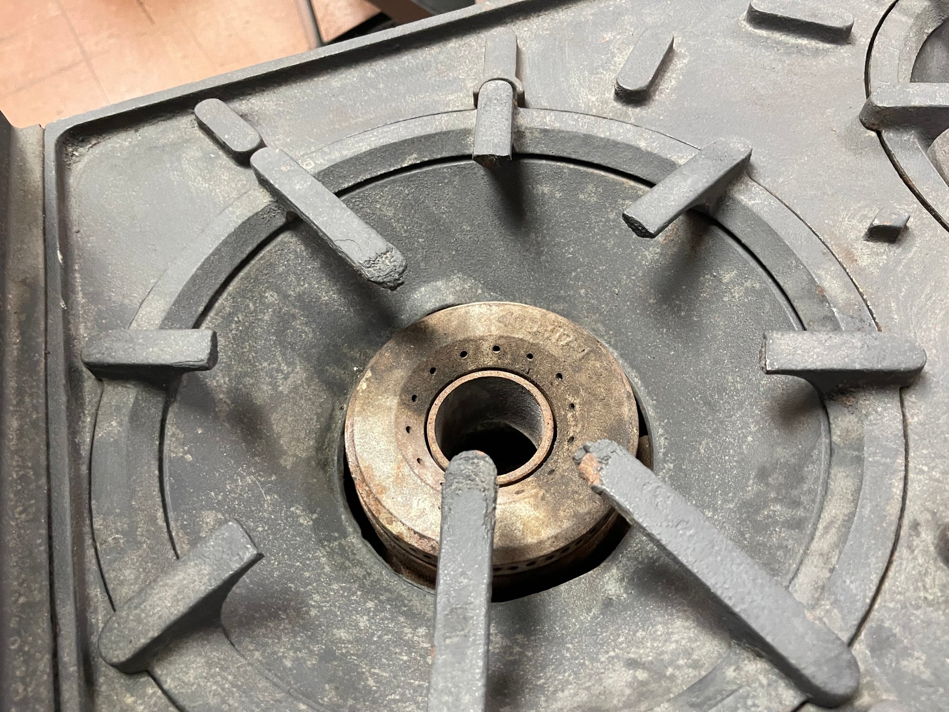 This range is used but has been cleaned and tested, There are scuffs and scratches on it from use. Some of the burner grates are broken and have pieces missing (see pictures). This is still an nice heavy duty stove with large 12" burners. The dimensions are 39"x34"x33". This stove is being sold as is.