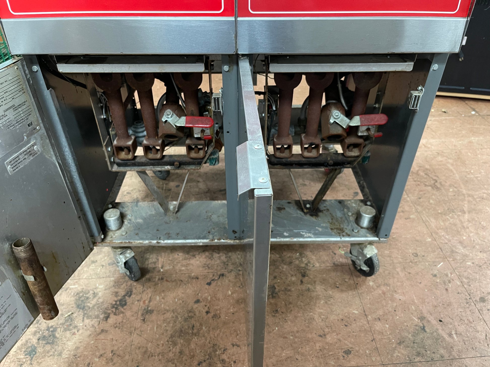 This fryer is used but has been cleaned and tested. There are some scuffs and scratches on it from use. This is a really nice fryer and is in good condition. The dimensions are 31"x29"x48" This is a dual 35lb fryer.